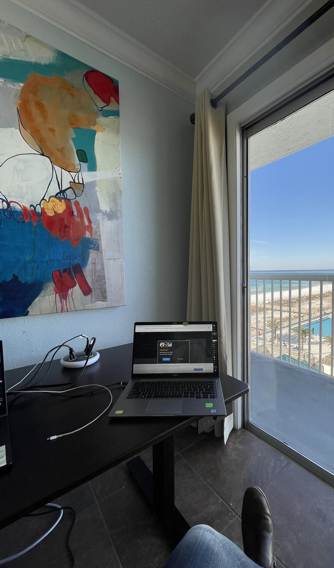 The vision: A beach condo where a professional can easily work and play. Just bring your phones, laptops, and swimsuits. I’ll create the home office for you, complete with standing desks, maybe multiple screens, a variety of cords, strong WiFi…everything else….